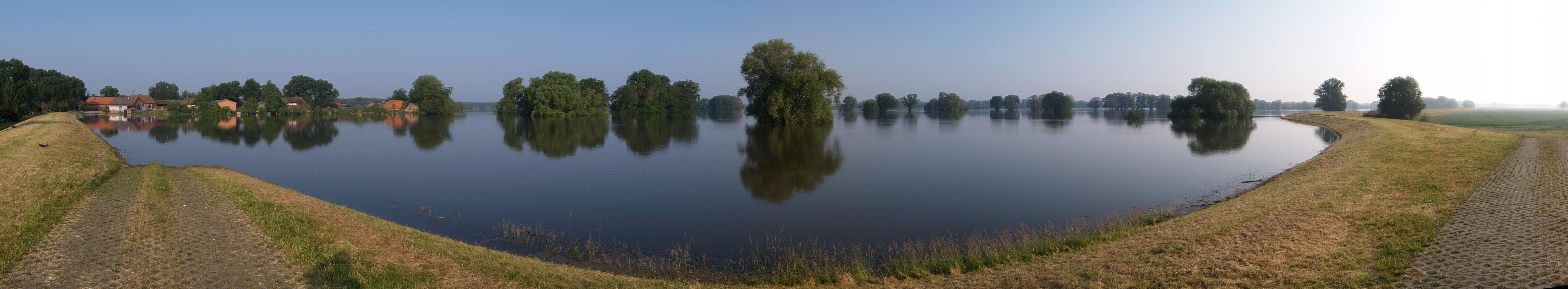 In der Nähe des Pegels den wir für die vielen Beiträge abgelesen hatten liegt auch einer unserer viel benutzten Fotopunkte, Ortskundige werden an den Fotos schon erkannt haben an welcher Stelle wir stehen. Hier nun einmal der Versuch eines 180°-Panoramas von diesem Punkt. Wenn ich daran denke werde ich nach Ablaufen des Wassers einmal eine “trockene” Vergleichsaufnahme machen…