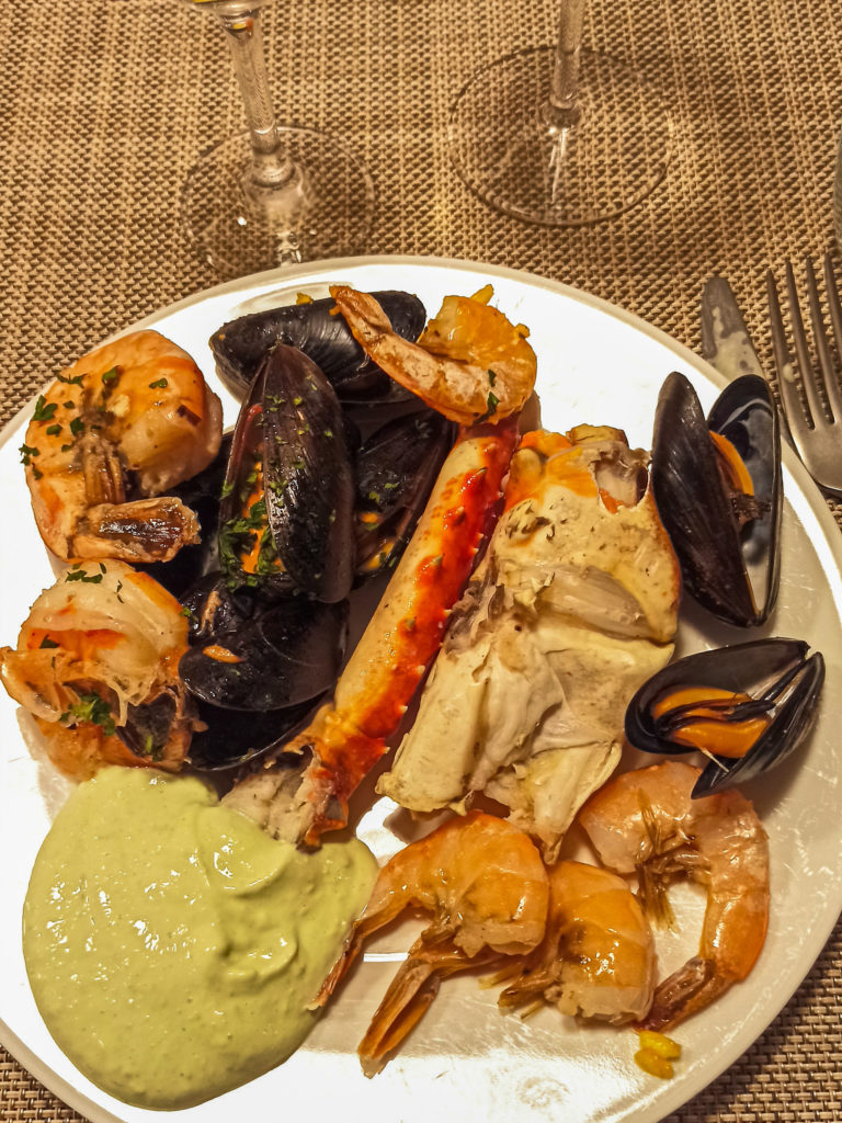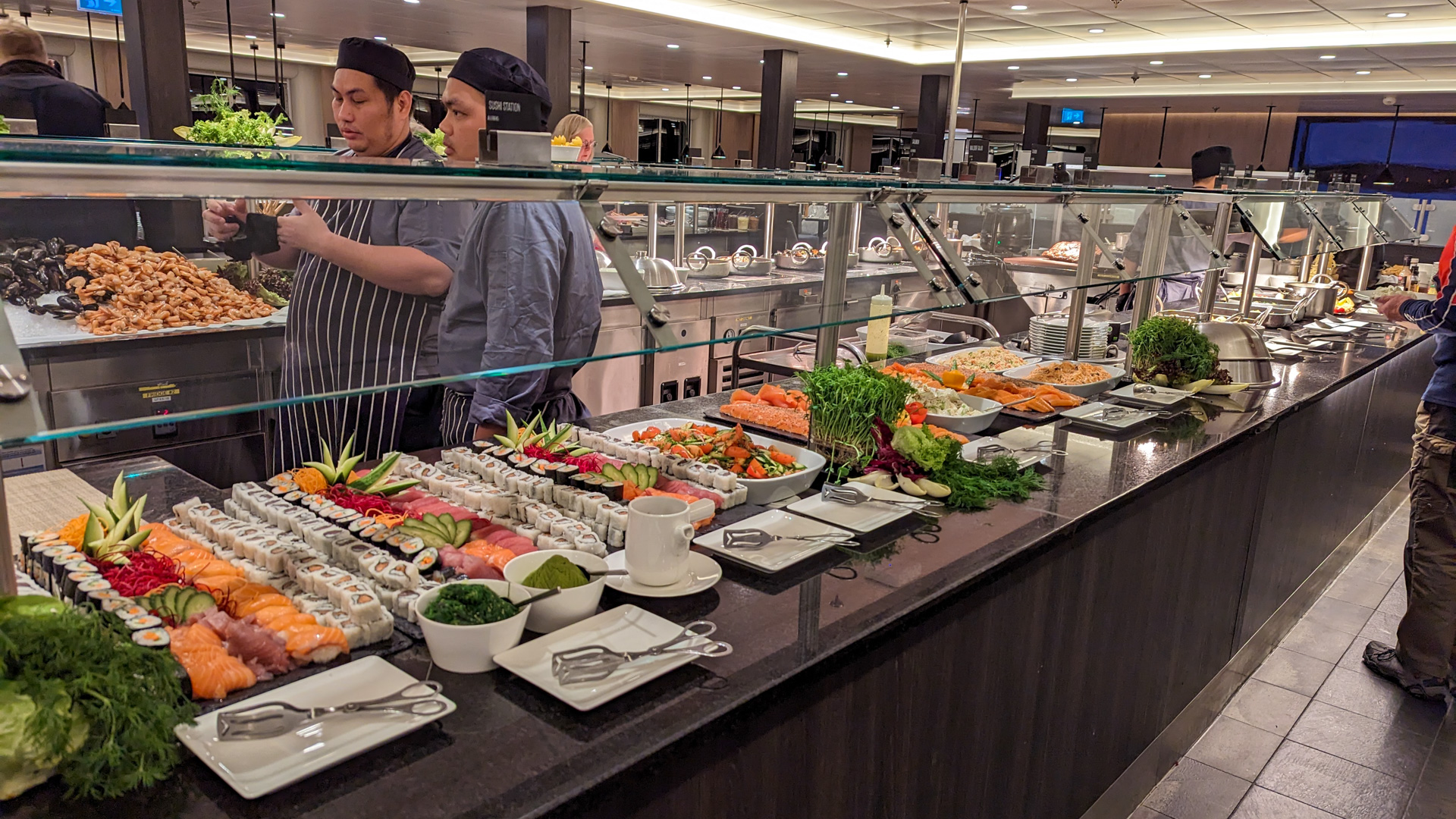 …und zum Schluß des Tages verkündete der Hotelchef an Bord eine Überraschung, die aufgrund seiner eigenen Indeskretionen schon lange keine mehr war – das heutige Abendessen war ein äußerst üppiges Meeresfrüchtebuffet, für die ca. 390 Gäste wurden rund 180kg Fische, Schalen- und Krustentiere aller Arten aufgefahren (irgendwo gabs auch einen Braten für die Fischverweigerer…), Einkaufspreis laut dem Chef rund 20.000€. Alles sehr lecker angerichtet, einige der Köstlichkeiten hatte ich noch nie gesehen, geschweige denn gegessen. Besonders freuten wir uns über die Königskrabben, wir hatten uns vorgenommen die während dieser Reise zu probieren. Mein persönliches Fazit speziell dazu: Schön, daß ich sie probieren konnte. Ich weiß jetzt daß sie kein sehr deutliches Aroma haben, einen Limfjord-Hummer würde ich sofort vorziehen.